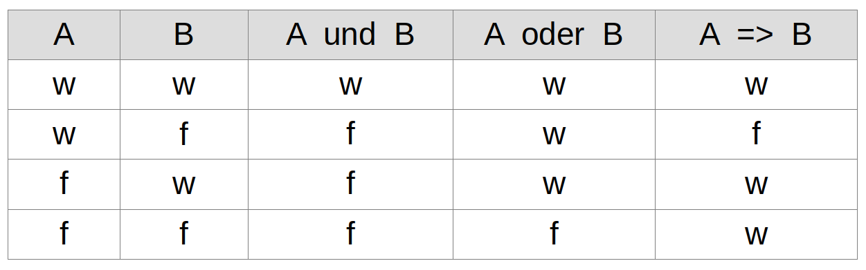 Die Aussagenlogik befasst sich mit Wahrheitstabellen und Schlussregeln.
